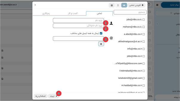 • ورود به وب میل جدید و رفتن به بخش چهارم و اطلاعات مخاطبان