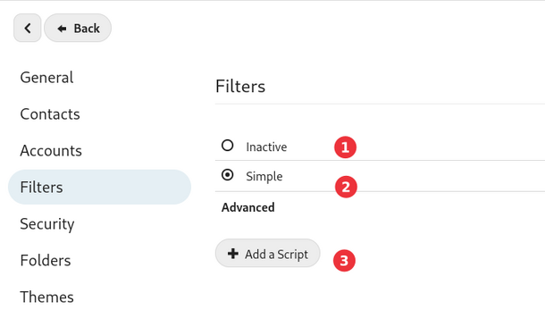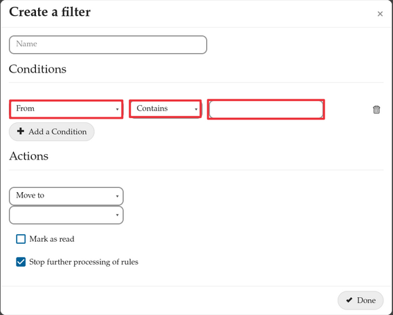 کاربران با ورود به بخش تنظیمات وب میل خود میتوانند بخش Filters (فیلتر ها) را در sidebar بخش تنظیمات مشاهده کنند.سپس در صفحه باز شده بر روی «Filters» کلید کنید. پس از ورود به این بخش کاربران میتوانند ۳ بخش مختلف را مشاهده کنند.پس از کلیک بر روی گزینه Simple پنجره ی جدیدی برای کاربران باز میشود که میتوانند از طریق آن فیلتر های جدید خود را تعریف یا فیلتر های تعریف شده را فعال و غیر فعال کنند.برای افزودن فیلتر بر روی گزینه «Add a condition» کلیک کنید.