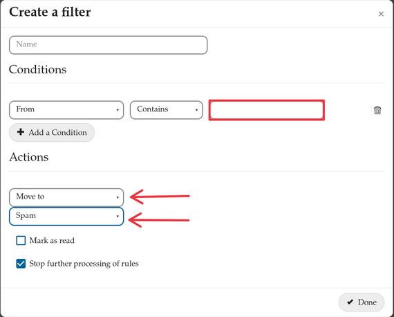 به عنوان مثال اگر بخواهیم نامهای که از آدرس example@gmail.com دریافت میشود به پوشه هرزنامه منتقل شود طبق عکس زیر عمل میکنیم: