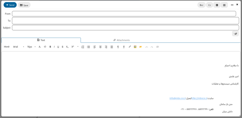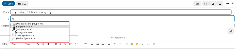 - قسمت به (To): آدرس گیرندگان پیام که با ویرگول ( , ) قابل تفکیک هستند و در صورت وجود در لیست تماس به صورت اتوماتیک توسط سیستم پیشنهاد داده میشوند.