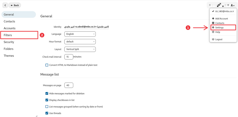 - گزینه Messages on page در بخش Message list : مربوط به تعداد پیامها در هر صفحه است. مقادیر انتخابی شامل ۱۰، ۲۰، ۳۰، ۵۰ و ۱۰۰ است.