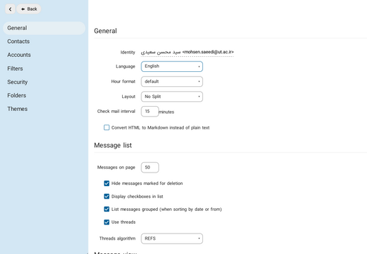 در این بخش تنظیمات عمومی وب میل قرار دارد که از پنج بخش General , Message list , Message view , Compose, Notifications تشکیل شده است و به شرح زیر است.