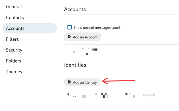 در Identity مشخصه حساب کاربری فعال ذکر شده است و با کلیک بر روی اکانت، امکان تعریف نام، Reply-To ، BCC و امضاء برای این حساب کاربری وجود دارد. ویرایشگر متن در این صفحه به منظور تعریف امضاء کاربر مورد استفاده قرار می گیرد.