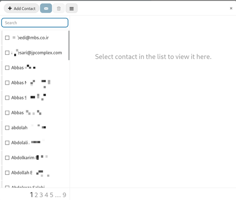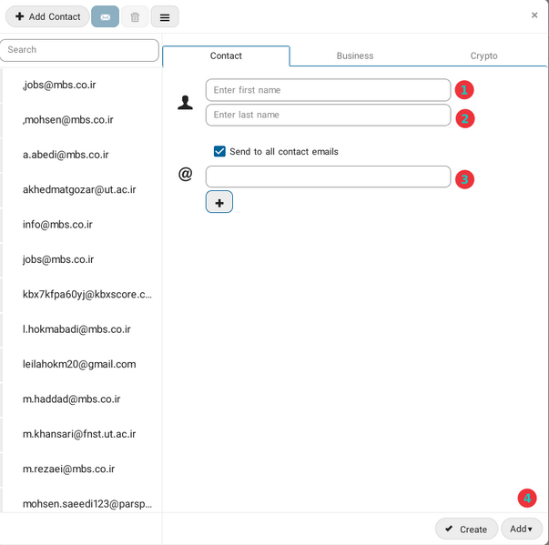 - قسمت مخاطبین (Contacts): امکان اضافه کردن آدرس جدید و یا انتخاب آدرس از این لیست برای ارسال پیام